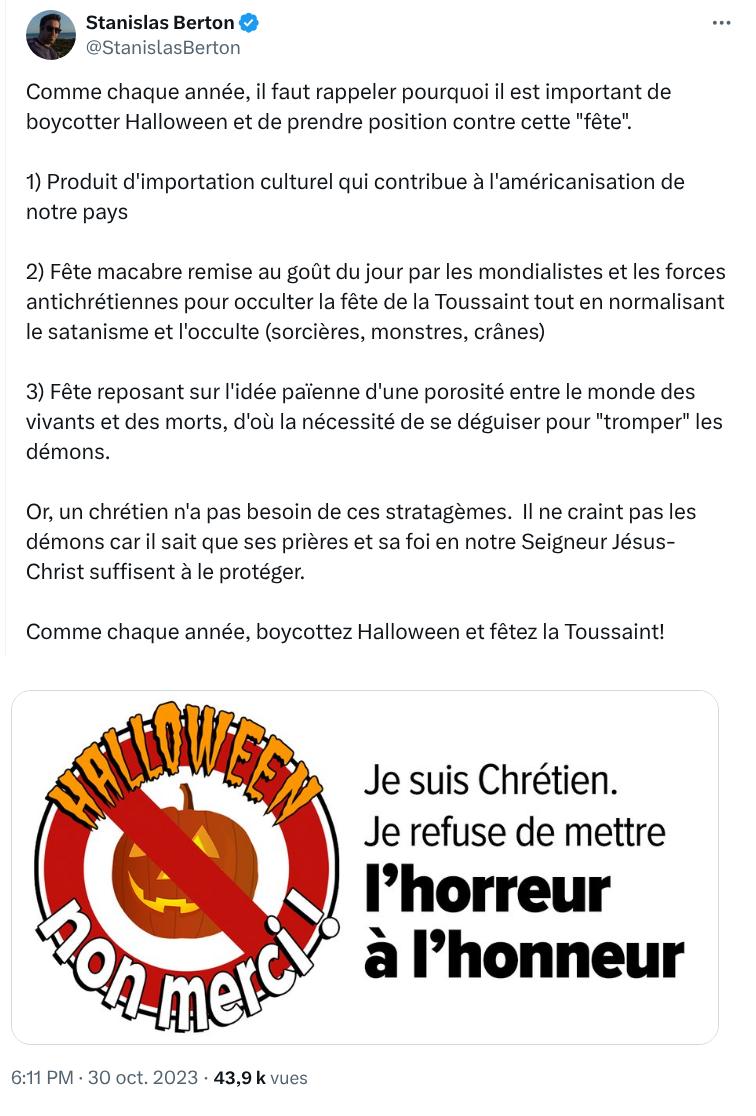 Combat spirituel, Etat Profond, Foi, Sociétés secrètes - Satanisme, Stanislas Berton Comme chaque année, il faut rappeler pourquoi il est important de boycotter Halloween et de prendre position contre cette « fête » octobre 30, 2025 / Source : https://x.com/StanislasBerton/status/1719039441505783858
