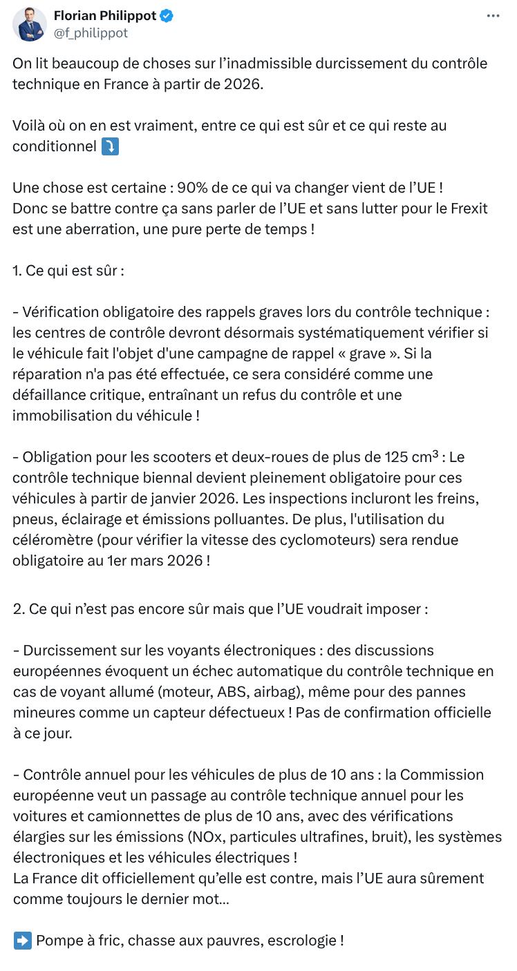 L’idée est de sortir de la conduite et de la propriété des millions de petites propriétaires de véhicules et de faire exploser les contre-visites et réparations au détriment du pouvoir d’achat des Français. Pendant ce temps aux Etats-Unis de nombreux États n’imposent pas de contrôle technique. On voit donc le problème de l’UE : des bureaucrates qui veulent imposer des idées extrémistes à tous les pays européens. Cela permet de contourner le vote des Français qui n’auraient jamais accepté de telles réglementations votées par leur gouvernement.