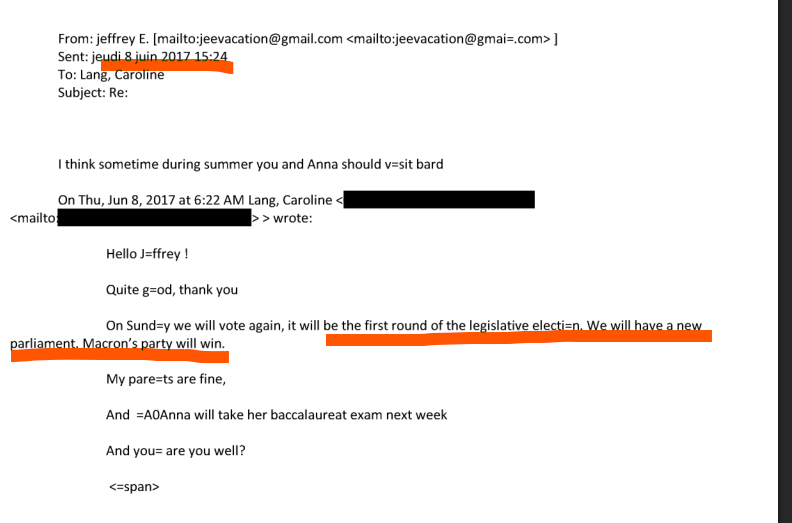 Epstein Files – Mail de Caroline Lang à Jeffrey Epstein en 2017, 3 jours avant le vote : « Le parti de Macron va gagner »