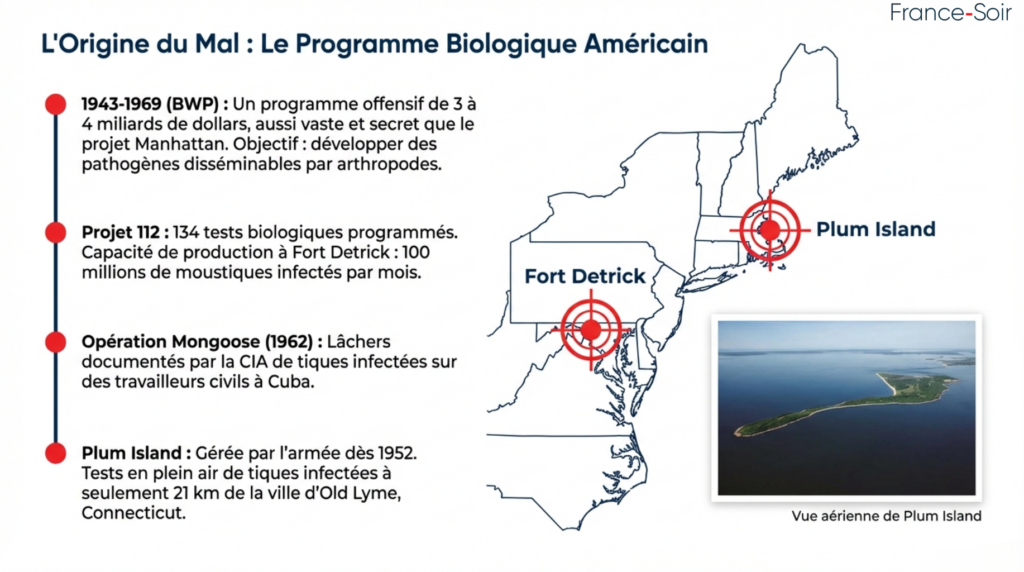 Le 4 mars 2026, le Dr Robert Malone publie sur son site « Substack » un long article choc intitulé « Des documents déclassifiés relient le programme américain d’armes biologiques à une épidémie de maladie de Lyme ». Il y révèle que des dizaines de documents déclassifiés (via FOIA, témoignages d’agents CIA, rapports du Congrès et archives militaires) établissent un lien direct entre le programme américain d’armes biologiques (BWP – Bioweapons Program, 1943-1969, financé à hauteur de 3-4 milliards de dollars) et l’explosion de la maladie de Lyme autour de Long Island Sound à partir des années 1970.