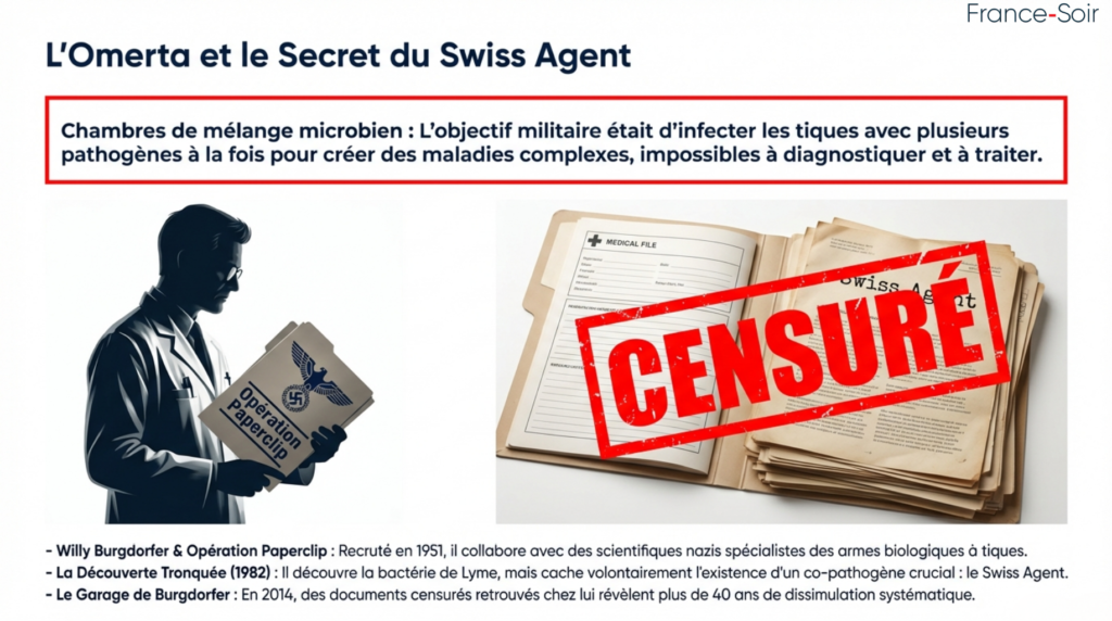 - Des scientifiques clés comme Willy Burgdorfer (recruté en 1951 pour la instrumentalisation des tiques) découvre la Borrelia burgdorferi en 1982 mais omet volontairement de publier sur le « Swiss Agent » (Rickettsia helvetica), un co-pathogène qui pourrait expliquer les formes chroniques sévères. Le recrutement, via l’Operation Paperclip, de scientifiques nazis comme Erich Traub, spécialiste des armes biologiques à tiques qui collabore à Plum Island.