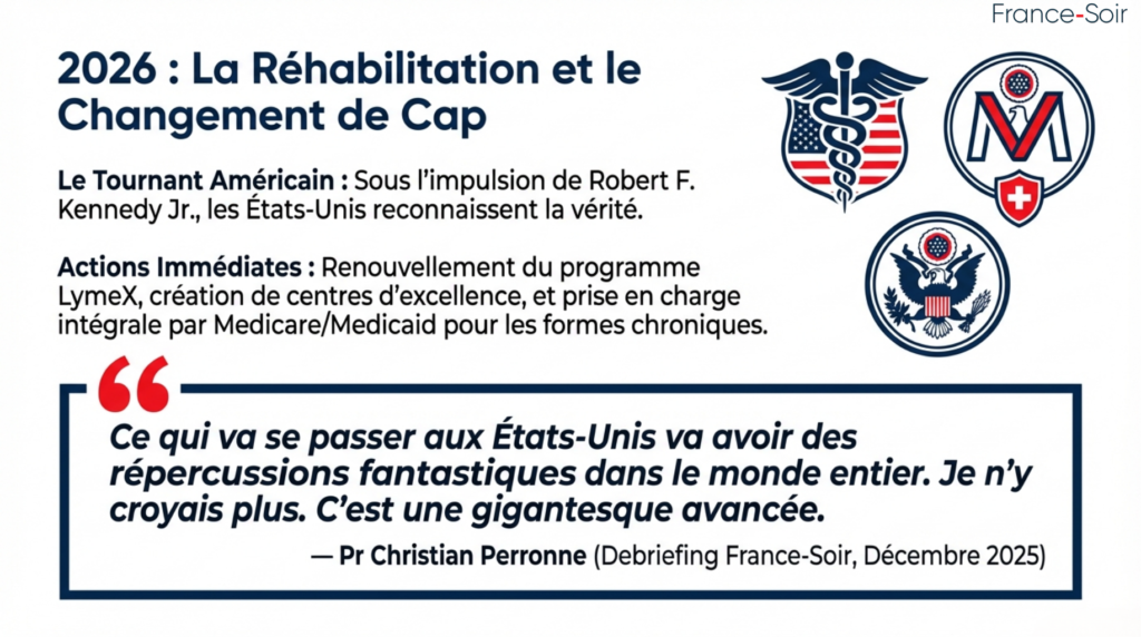 Le 16 décembre 2025, dans un debriefing vidéo pour FranceSoir, le Pr Perronne salue avec un « immense moment de joie » les annonces américaines de Robert F. Kennedy Jr. (alors secrétaire à la Santé) : renouvellement du programme LymeX, création de centres d’excellence, études pédiatriques du NIH, page dédiée sur hhs.gov/lyme et meilleure prise en charge par Medicare/Medicaid. Il déclare : « Ce qui va se passer aux États-Unis va avoir des répercussions fantastiques dans le monde entier. Je n’y croyais plus. C’est une gigantesque avancée. »