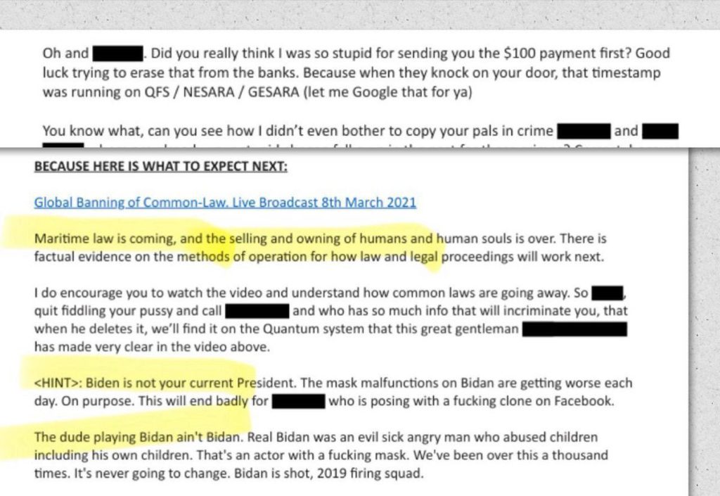 « <INDICE> : Biden n’est PAS ton Président actuel. Les dysfonctionnements de masque sur Bidan empirent de jour en jour. Exprès. Ça va mal finir pour [REDACTED] qui pose avec un putain de clone sur Facebook. Le mec qui joue Biden n’est PAS Biden. Le vrai Biden était un homme mauvais, malade, en colère, qui abusait des enfants, y compris ses propres enfants. C’est un acteur avec un putain de masque. On en a déjà parlé mille fois. Ça ne changera jamais. Biden a été fusillé, peloton d’exécution en 2019. »