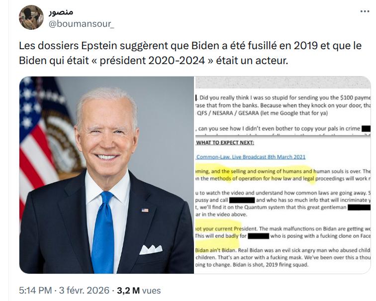 Les dossiers Epstein suggèrent que Biden a été fusillé en 2019 et que le Biden qui était « président 2020-2024 » était un acteur