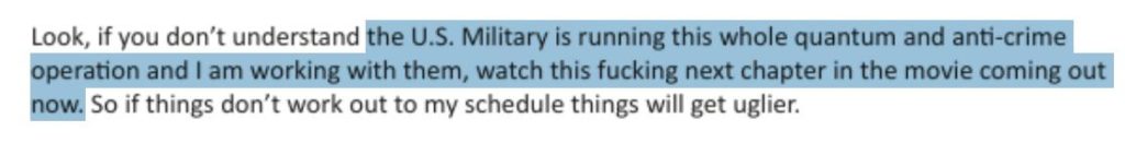 « Écoute, si tu ne comprend pas que l’armée américaine dirige toute cette opération quantique et anti-criminalité et que je travaille avec eux, regarde le prochain chapitre de ce putain de film qui sort maintenant. Donc, si les choses ne se passent pas comme prévu, ça va mal tourner. »
