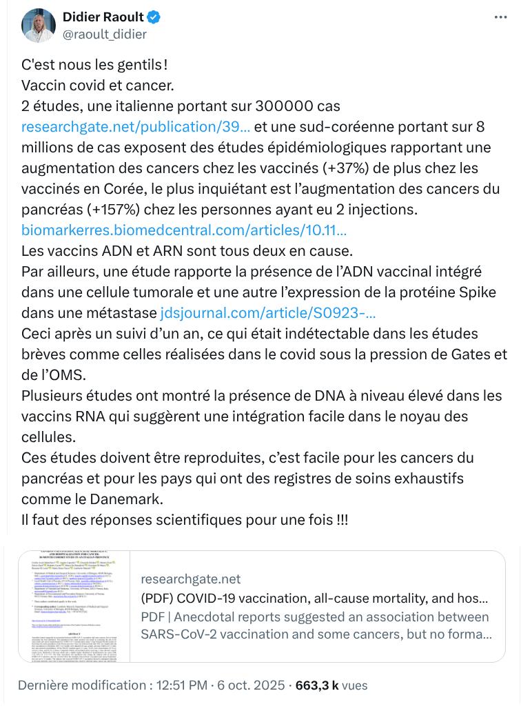 Tweet du Pr. Didier Raoult du 6 octobre 2025 :