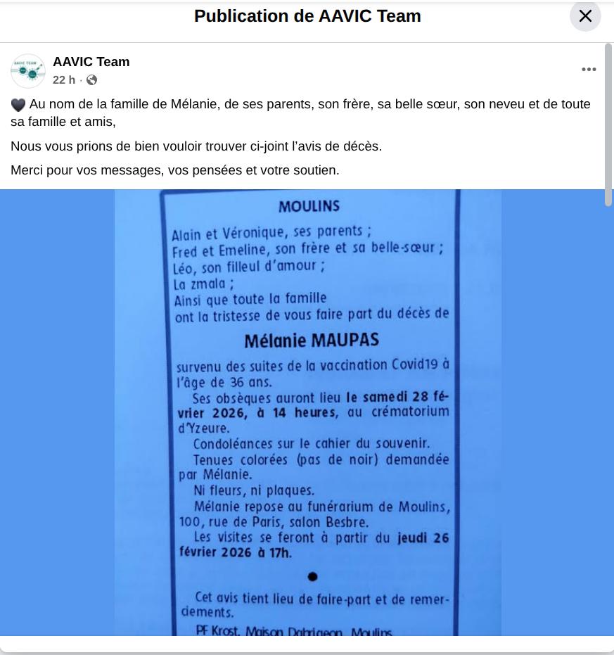 Effets indésirables, Témoignages EI, Vaccins Mélanie Maupas, qui avait contracté la maladie de Charcot suite au vaccin Covid, est décédée le 24 février 2026 février 25, 2026 / Source : Facebook – Publié le 24 février 2026 Source : Facebook