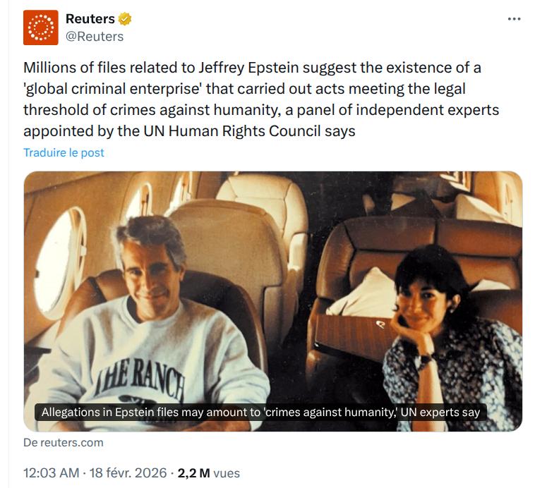 Source en anglais : https://www.reuters.com/world/allegations-epstein-files-may-amount-crimes-against-humanity-un-experts-say-2026-02-17/