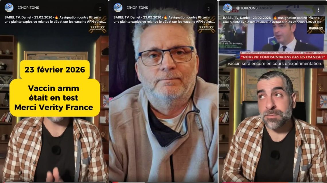 Vidéo du 23 février 2026 (durée 2 min) : Source vidéo Odysée : https://odysee.com/@HORIZONS:d/BABEL-TV,-Daniel—23.02.2026–%F0%9F%94%A5-Assignation-contre-Pfizer—une-plainte-explosive-relance-le-d%C3%A9bat-sur-les-vaccins-ARN-et-les-d%C3%A9clarations-officielles:b?view=shorts Source YT de Babel.TV Cette vidéo téléchargée sur notre site : https://la-verite-vous-rendra-libres.org/wp-content/uploads/2026/02/babel-Marc-Doyer.mp4