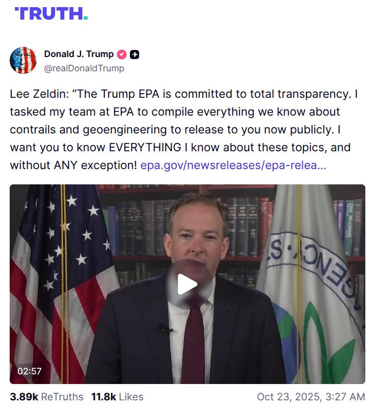 Lee Zeldin : « L’EPA de Trump s’engage à faire preuve d’une transparence totale. J’ai chargé mon équipe à l’EPA de compiler tout ce que nous savons sur les traînées de condensation et la géo-ingénierie afin de vous le communiquer publiquement dès maintenant. Je veux que vous sachiez TOUT ce que je sais sur ces sujets, sans AUCUNE exception !