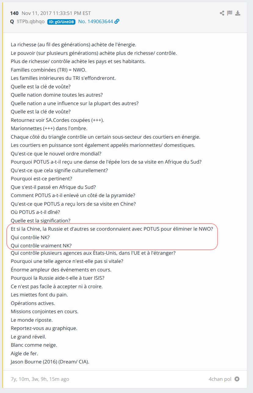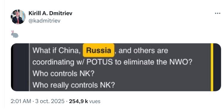 Le 3 octobre 2025, un membre officiel du gouvernement de Russie, Kirill A. Dmitriev, poste ouvertement un Drop de Q sur X, il s’agit du « Special Envoy of the President of Russia for investment and economic cooperation » !! Un peu plus tard dans la journée, c’est au tour du compte officiel de la Maison Blanche de faire des références explicites aux « théories » QAnon !