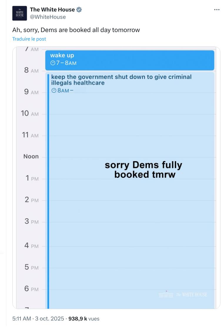 Posté par le compte X officiel de la Maison Blanche : « Ah, désolés, les Démocrates, on est occupé toute la journée demain »